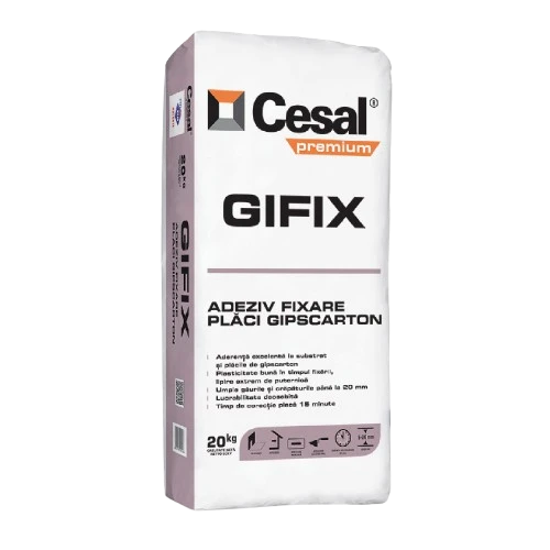 CESAL GIFIX este adezivul pe bază de ipsos special conceput pentru fixarea rapidă și extrem de puternică a plăcilor de gipscarton pe diverse substraturi interioare, precum beton, cărămidă, BCA sau tencuieli pe bază de ciment-var și ipsos. Datorită formulei sale avansate, beneficiați de o aderență excelentă atât la substrat, cât și la placă, plasticitate bună în timpul aplicării și o lucrabilitate deosebită, pasta cremoasă fiind ușor de manevrat cu un timp de lucru de minim 50 de minute. Un avantaj practic major este timpul de corecție a poziției plăcii de 15 minute, permițând ajustări precise pentru a obține rapid suprafețe perfect netede, pregătite ideal pentru finisare cu gleturi superfine, de exemplu Cesal FIN GLET, și ulterior vopsire.