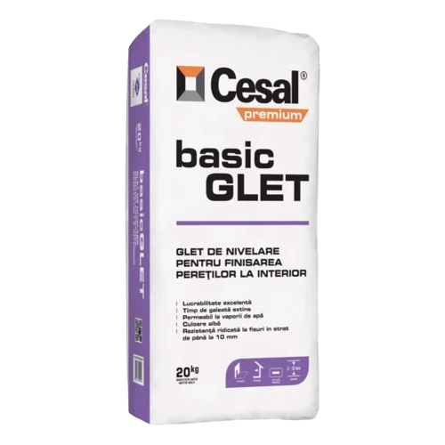 CESAL PREMIUM BASIC GLET este gletul pe bază de ipsos ideal pentru egalizarea și umplerea eficientă a denivelărilor de 2-10 mm pe suprafețe interioare din beton sau tencuieli uscate (pe bază de ciment sau ciment-var), fiind perfect și pentru reparații ale suprafețelor gletuite. Ușor de preparat, acesta formează o pastă cremoasă, omogenă și ușor prelucrabilă, cu un timp de lucru generos de minim 60 de minute, asigurând o aplicare simplă cu gletiera din inox. După uscare, suprafața se poate șlefui cu hârtie abrazivă fină pentru a obține un suport perfect neted și plan, pregătit ideal pentru aplicarea unui glet de finisaj, cum ar fi Cesal FIN GLET, sau direct pentru vopsire.